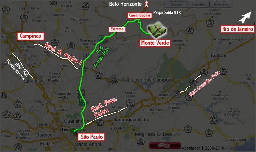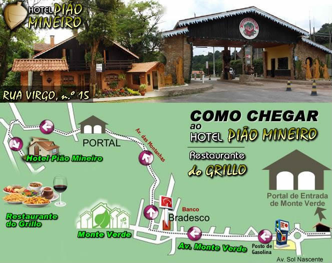 Saindo do Rio de Janeiro, siga pela Rodovia Presidente Dutra (BR-116) em direção a São Paulo. Ao chegar em São José dos Campos, pegue a saída para a Rodovia SP-123 e siga em direção a Monteiro Lobato, acessando depois a SP-50. Continue pela estrada até chegar em Camanducaia. De lá, siga por aproximadamente 30 km serra acima até Monte Verde. Ao entrar no distrito, vá até a Rua Virgo, 15 – Portal das Montanhas, onde está localizado o Hotel Pião Mineiro.